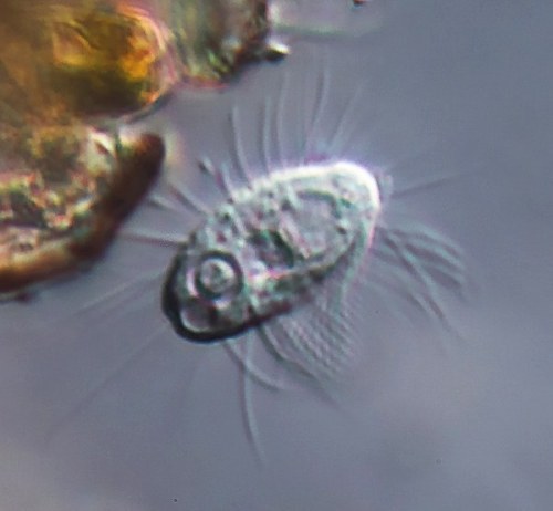 über dem Gänsehalstierchen zu sehende Coleps (ein recht kleines Exemplar) verfügt