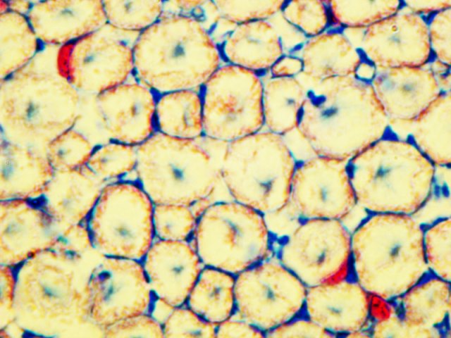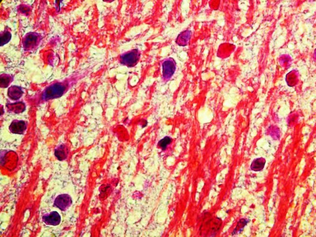 Hier ist ein Schnitt durch das Rückenmark eines Froschs zu sehen, in 1000facher Vergrösserung: